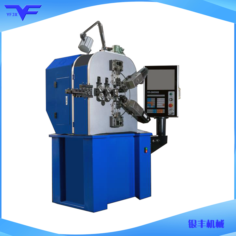 CNC-YF-8630多轴数控压簧机可生产(0.15-12.0mm线径)本机拥有传统机械压簧机的特点,配备现代化电脑控制伺服系统的高速与精确,系统备置电脑,可储存上百个工作程序,各轴的位置、送线资料、生产速度、生产数量都是显示在屏幕上,程序资料很容易在键盘上设定及改变,间距调节方便灵活,外径轴独立,可通过设定程序轻松调整外径大小,压簧机无需调整机械部分即可生产任意形状压缩弹簧,完全避免了更换凸轮片的麻烦,调节及为方便。适用于各式压缩弹簧、油封弹簧、宝塔簧、波形弹簧、汽车弹簧等