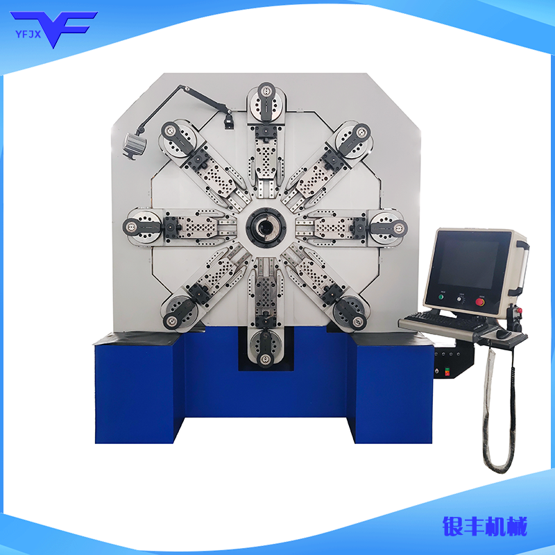 CNC-YF-12100无凸轮弹簧机多轴数控弹簧机可生产(0.2-10.0mm线径)无凸轮转线弹簧机采用独特的无凸轮和无摇臂设计,由多组伺服马达独立控制,每个工位上都有单独伺服驱动,卷曲功能具有可拆卸式安装功能,对于折角处理和圆弧折弯具有较快的处理速度,转线系统功能,解决了弹簧机在送线过程中整个送线可正反向360度旋转,实现了多角度成型和切断等,为方便完成您所要求的各类形弹簧试样及生产,在工作过程中并设有精度检测跟踪装置,保证弹簧品质优良,可生产各种各样异型弹簧、压簧、双扭簧、电池簧、扁簧(发条簧)及各种线成型等,精密准确、调机快速、稳定可靠是用户的理想设备。